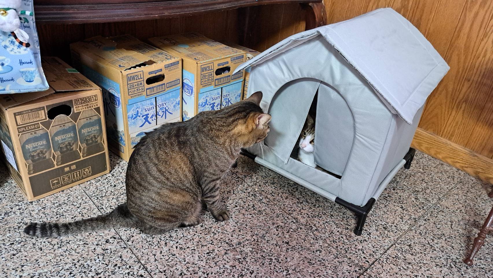 新しく購入した猫ハウスに興味を示す猫と既に堪能中の猫です(笑)。