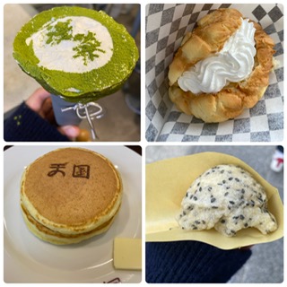 抹茶のティラミスクレープと、焼きたてメロンパンにたっぷりのホイップクリームを挟んだスイーツがめちゃくちゃ!!美味しゅう!!(メロンパンは一個が大きいので、3人でシェアして食べました🍈)