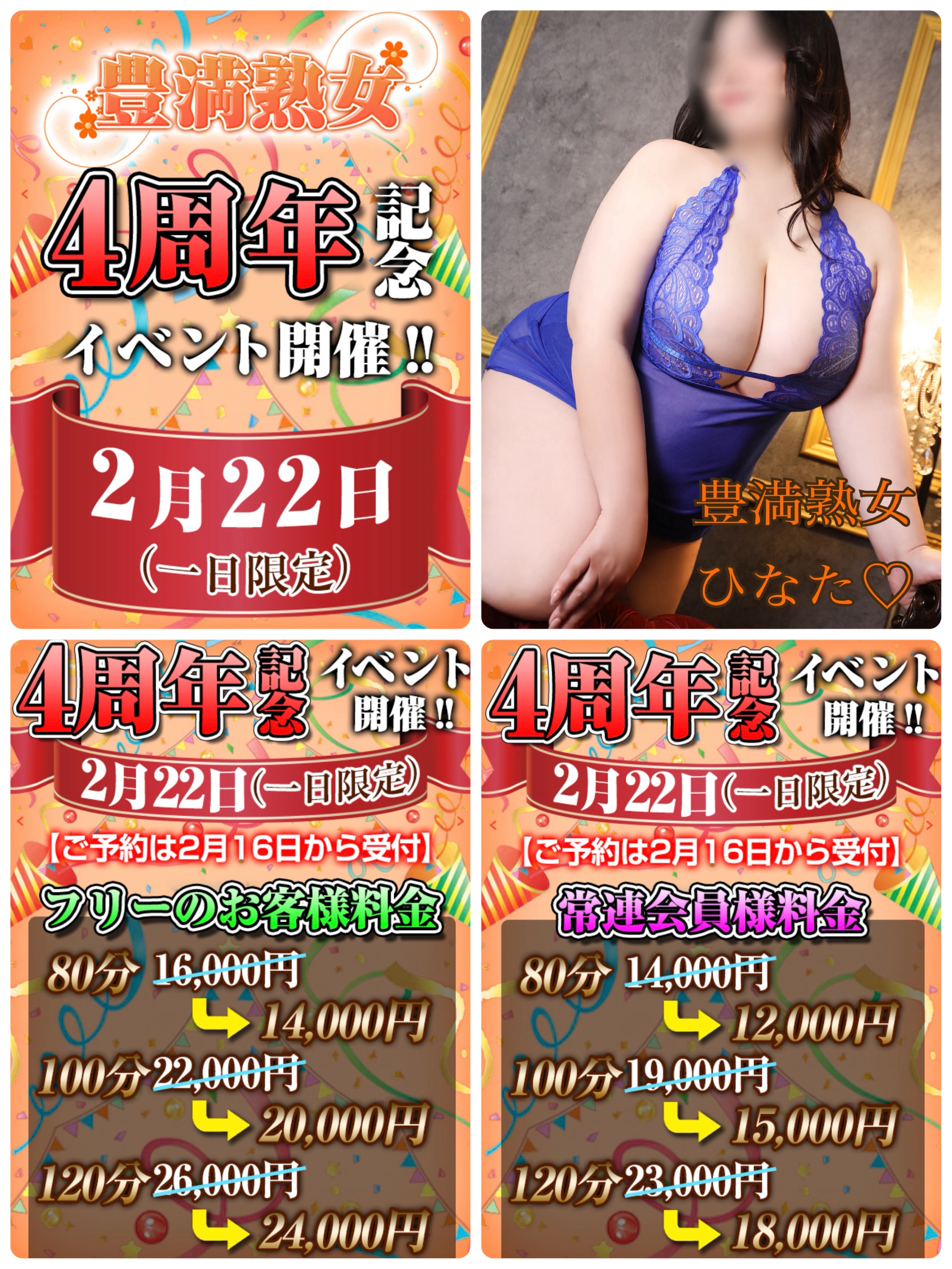 明日は❤️ 2026/02/21 19:11:14 こんばんは♪ひなたです♪いよいよ明日は4周年記念イベントDAYです❣️いつもよりお安く遊べる1日です🥰ご都合よろしければ是非お誘いくださいね☆12:00〜18:00でお待ちしております❤️